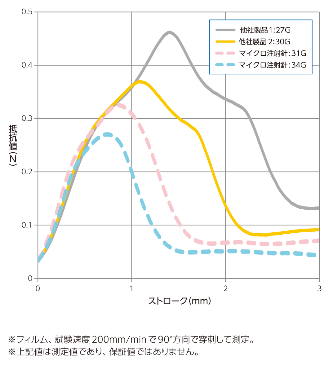 針先端は切れ味のよいランセットポイントを採用しております。また、マイクロ注射針は一般的な針に比べ非常に細い為、穿刺抵抗 値が低く、患者様の痛みを低減することができます。